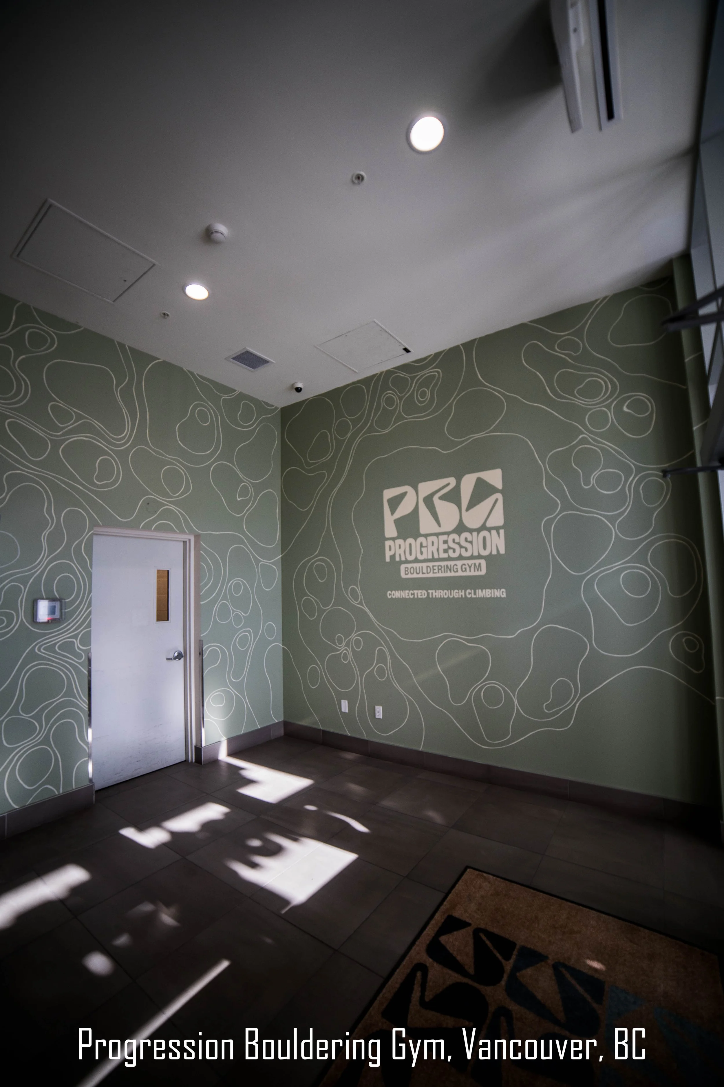 Interior of Progression Bouldering Gym in Vancouver, BC, with a wall displaying the gym's logo and abstract wall art, sunlight casting shadows on dark tiled floor, door on the left, ceiling lights.